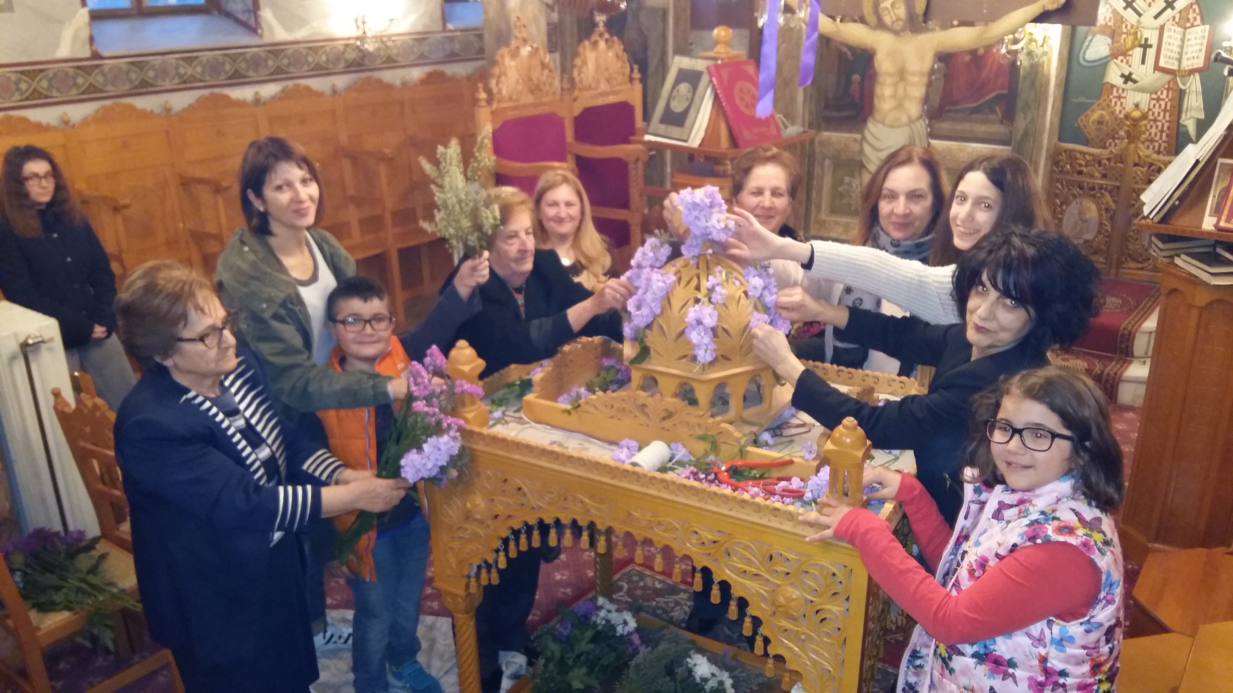 Όλες τις ημέρες της Μεγάλης Εβδομάδας έγινε λειτουργία στην εκκλησία του χωριού μας. Το βράδυ της Μεγάλης Πέμπτης ,μετά την ακολουθία των Δώδεκα Ευαγγελίων ,αρκετοί συγχωριανοί παρέμειναν στην εκκλησία για τον στολισμό του Επιταφίου με λουλούδια που είχε φροντίσει η εκκλησιαστική επιτροπή να αγοράσει.